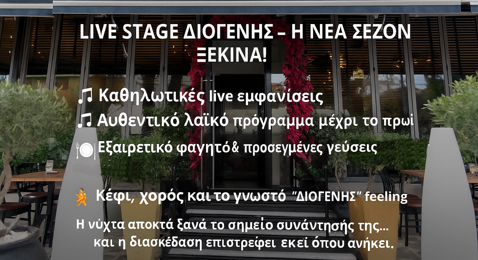 Με εξαιρετική κουζίνα, ζωντανή μουσική και πλήρη τεχνική υποστήριξη ήχου & φωτισμού, το ΔΙΟΓΕΝΗΣ Live Stage προσφέρει μια μοναδική εμπειρία διασκέδασης και φιλοξενίας.